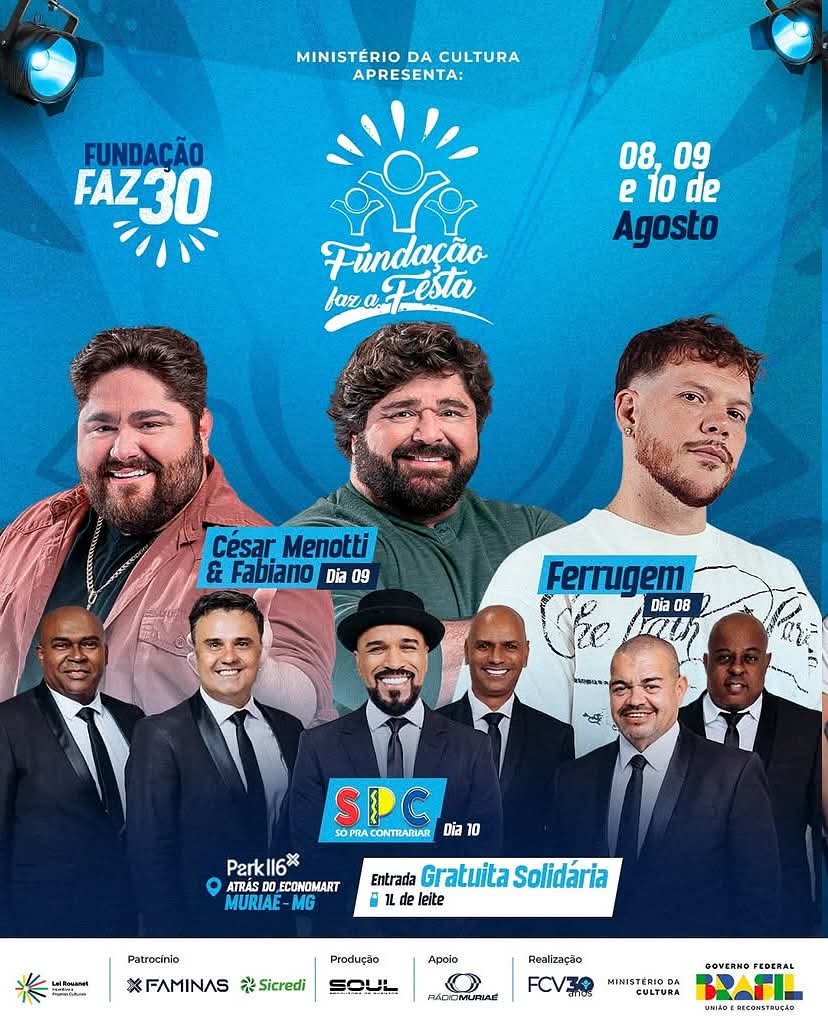 EVENTO “FUNDAÇÃO FAZ A FESTA” TERÁ SHOWS EM MURIAÉ COM FERRUGEM, CÉSAR MENOTTI E FABIANO E SPC