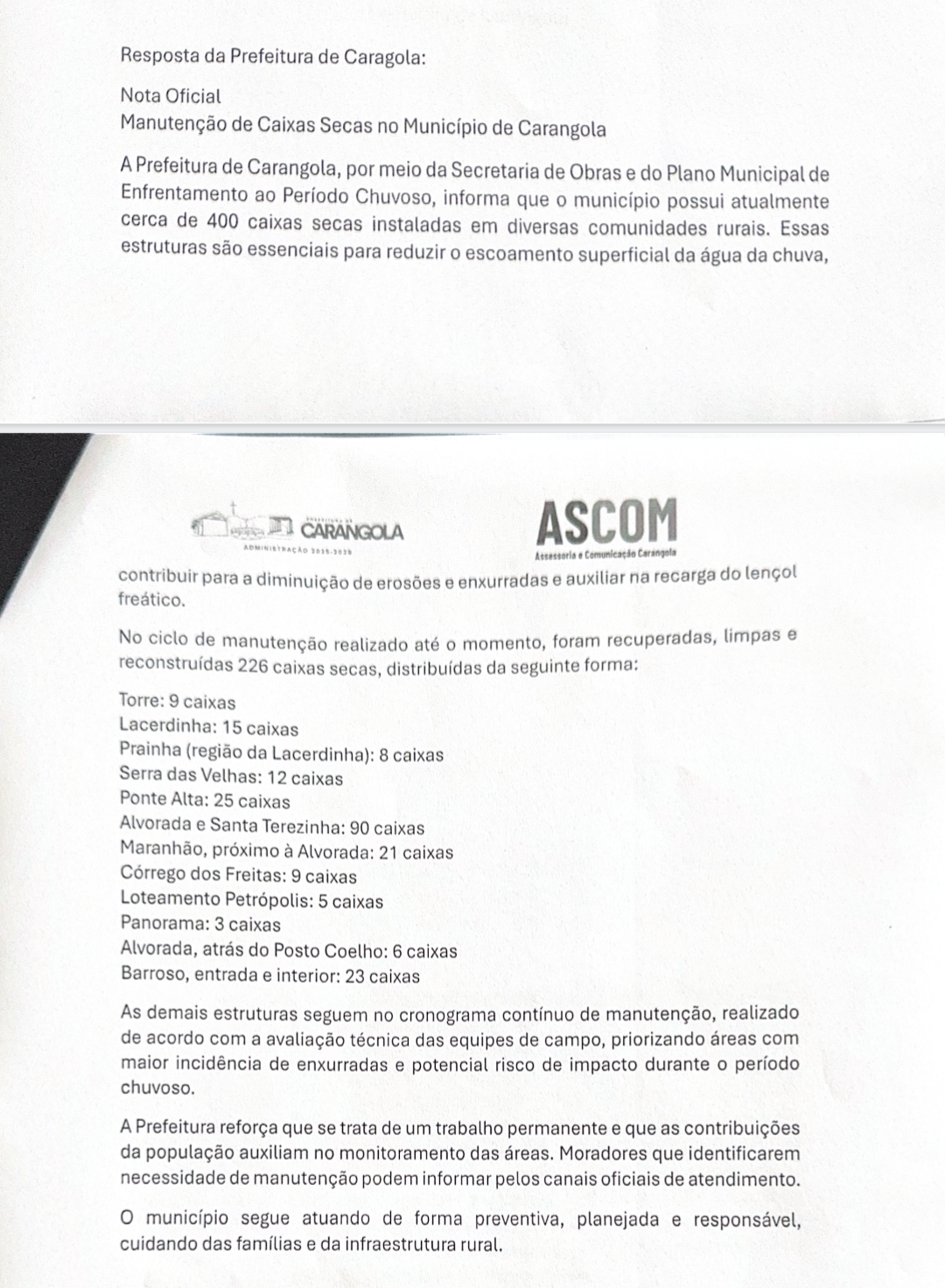 Alguns moradores da zona rural de Carangola recorreram à coluna Fala Cidadão, do portal Carangola Notícias, para denunciar o suposto abandono de dezenas de caixas secas construídas em diversas localidades rurais do município. Segundo os relatos enviados à redação, as estruturas — fundamentais para o controle inteligente do escoamento das chuvas — estariam sem manutenção, acumulando terra e vegetação, o que pode gerar sérias consequências no período chuvoso.