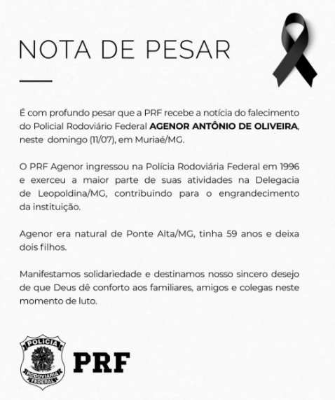 Faleceu neste domingo (11), o Policial Rodoviário Federal Agenor Antônio de Oliveira (o conhecido Genorinho), de 59 anos. Agenor era natural de Carangola, mais especificamente do distrito de Ponte Alta de Minas. Ele ingressou na Polícia Rodoviária Federal em 1996, possuindo cerca de 25 anos de serviços prestados na instituição policial.