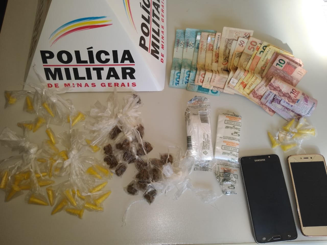 NA RESIDÊNCIA DE J.P.S., FORAM LOCALIZADOS SOBRE UM GUARDA-ROUPAS, 35 (TRINTA E CINCO) PINOS DE COCAÍNA, BEM COMO 19 (DEZENOVE) BUCHAS DE MACONHA. NA RESIDÊNCIA DE B.B.O. FORAM LOCALIZADOS NO QUARTO DO MESMO E DE SUA COMPANHEIRA D.G.A. 06 (SEIS) PINOS DE COM MACONHA, 02 (DOIS ) CELULARES, 02 (DUAS) EMBALAGENS CONTENDO 100 (CEM) SAQUINHOS CADA UMA DE “CHUP-CHUP” , GERALMENTE USADOS PARA EMBALAR ENTORPECENTES, E R$ 865,00 (OITOCENTOS E SESSENTA E CINCO REAIS) JUNTOS COM OS DOCUMENTOS PESSOAIS (RG) DO CASAL.