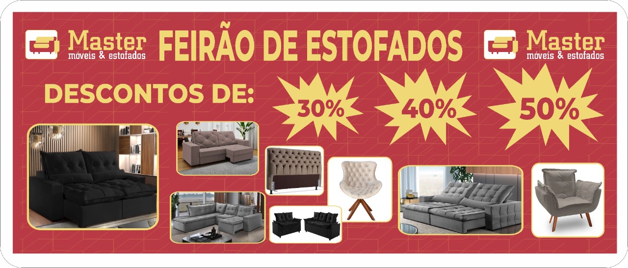 Acontecerá neste sábado (09) e domingo (10) o FEIRÃO DE ESTOFADOS DA LOJA MASTER MÓVEIS na cidade de CAPARAÓ Novo. Após o sucesso do Feirão de Estofados em CARANGOLA, a loja Master Móveis baixou ainda mais os preços e promoverá o Feirão com até 50% de Desconto em SOFÁS RETRÁTEIS, SOFÁS DE CANTO, SOFÁS DE 2 E 3 LUGARES, CABECEIRAS ESTOFADAS E POLTRONAS. Tem pra todos os gostos!!!