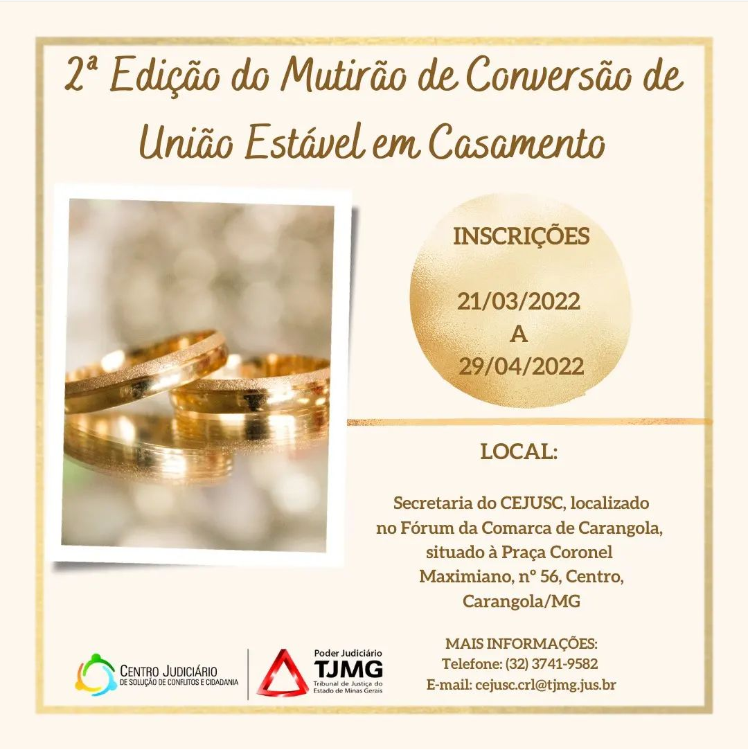 O Tribunal de Justiça de Minas Gerais, através do CEJUSC CARANGOLA, realizará um mutirão de Audiências de Conversão de União Estável em Casamento.