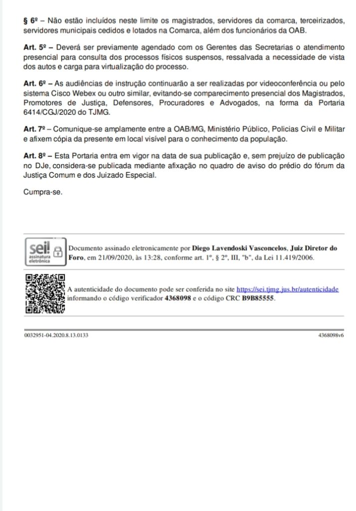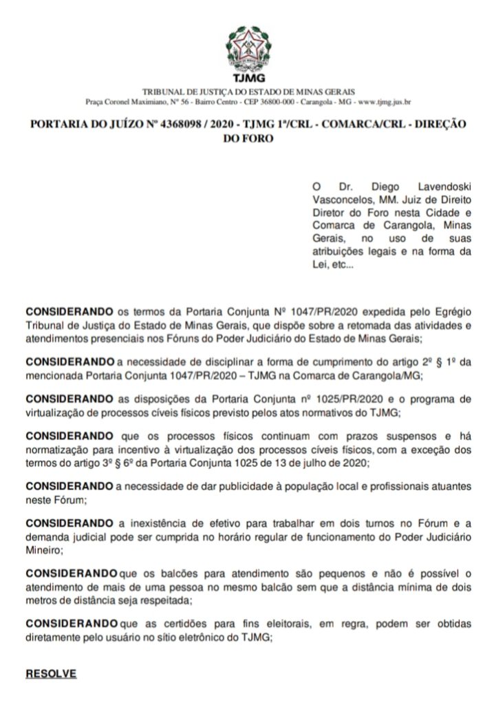 FÓRUM DE CARANGOLA É REABERTO AO ATENDIMENTO PRESENCIAL AO PÚBLICO; CLIQUE E CONFIRA A PORTARIA DO MM. JUIZ DIRETOR DO FORO DA COMARCA DE CARANGOLA