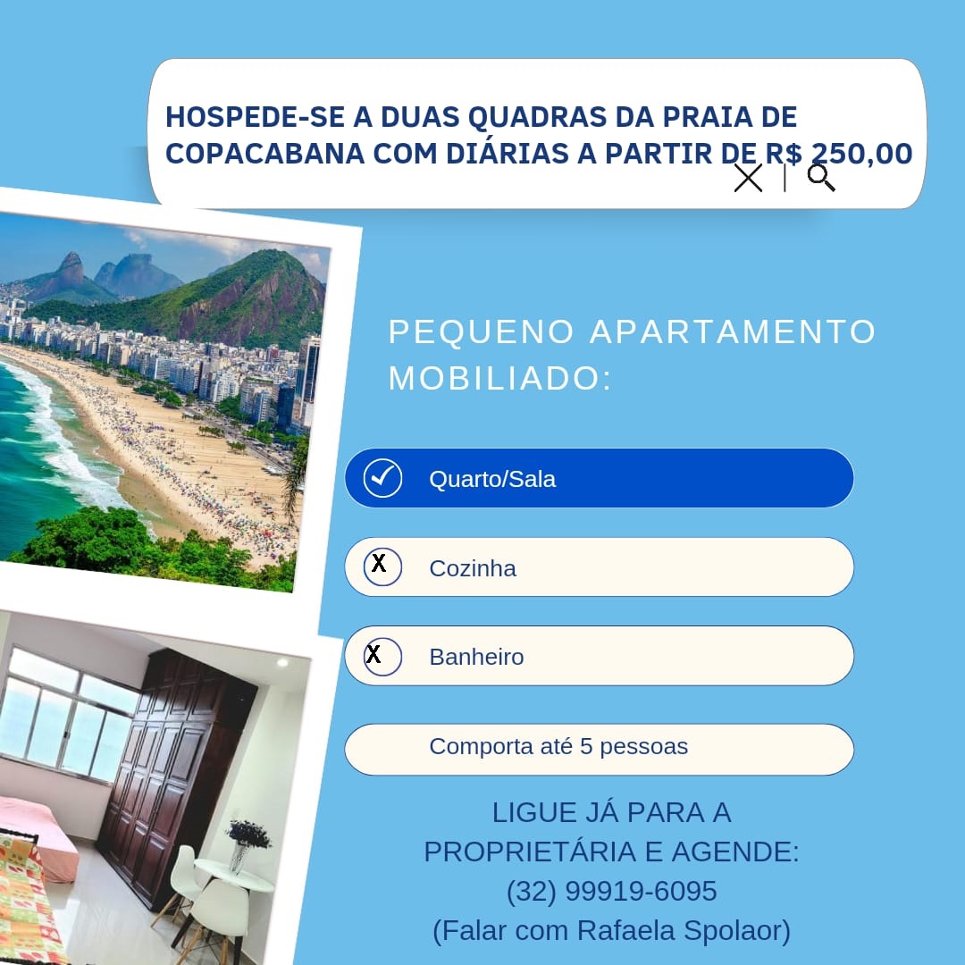TRAZEMOS A VOCÊ A OPORTUNIDADE DE HOSPEDAR EM UM PEQUENO APARTAMENTO EM COPACABANA, NO RIO DE JANEIRO, COM LOCALIZAÇÃO PRIVILEGIADA, HÁ POUCOS METROS DA PRAIA E COMÉRCIO EM GERAL, E COM PREÇO ACESSÍVEL: DIÁRIAS A PARTIR DE R$ 250,00 .