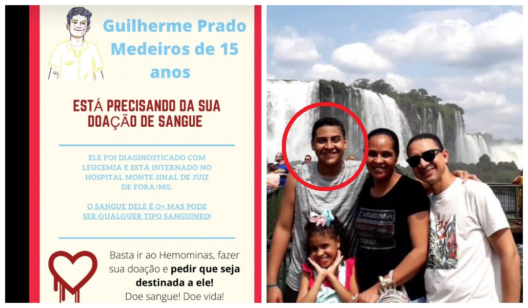 O adolescente GUILHERME PRADO MEDEIROS, de 15 anos, filho do casal carangolense Márcio Medeiros (enfermeiro) e Angélica, foi diagnosticado com Leucemia nesta última semana e se encontra internado no Hospital Monte Sinai em Juiz de Fora, cidade onde a família reside atualmente. Guilherme está necessitando doações do SANGUE O+, mas pode ser doado qualquer tipo sanguíneo, podendo a doação ser feita no HEMOMINAS MANHUAÇU OU DE JUIZ DE FORA.