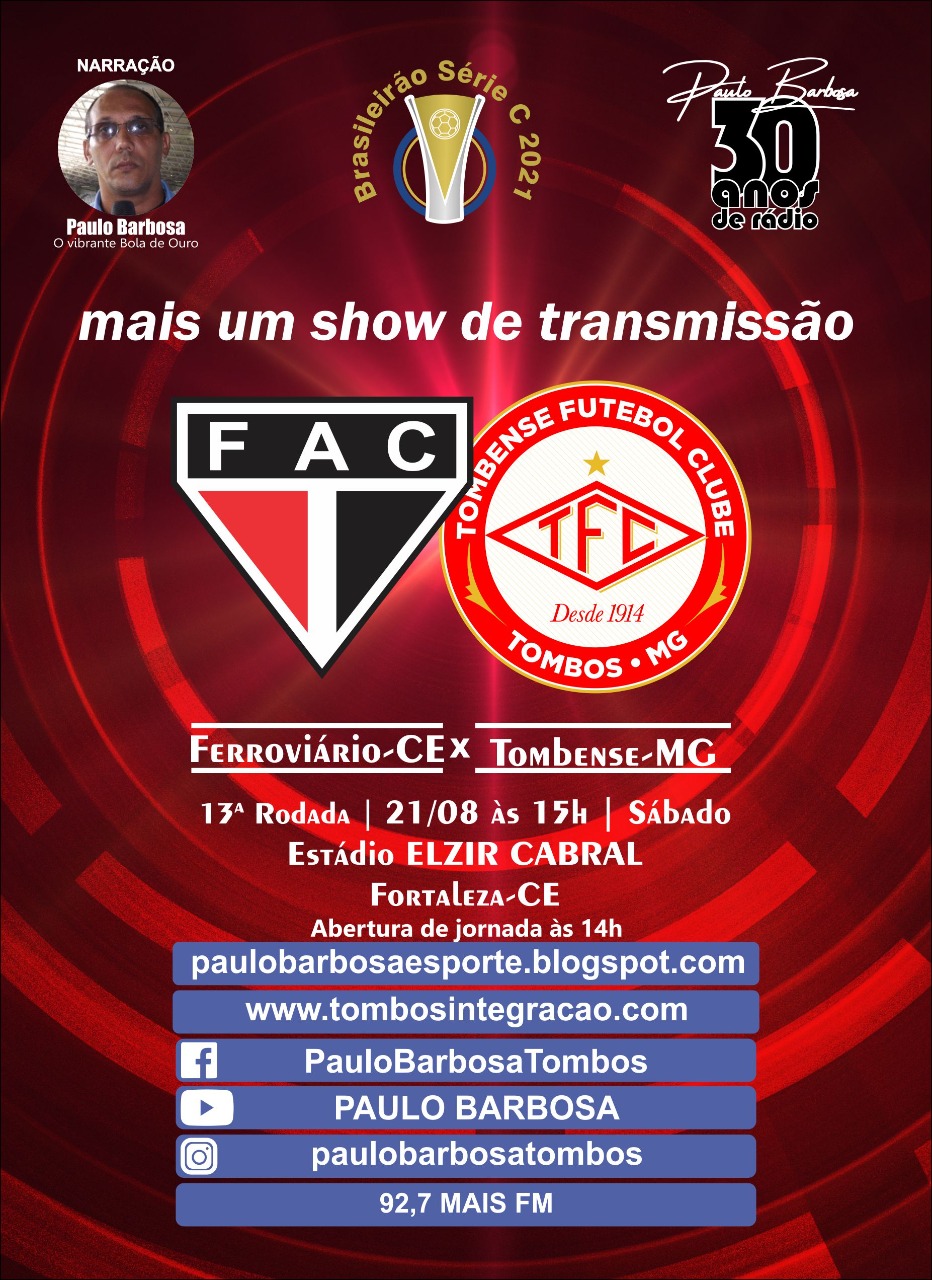 HOJE TEM FERROVIÁRIO-CE X TOMBENSE A PARTIR DAS 15H PELO BRASILEIRÃO SÉRIE C; PAULO BARBOSA E EQUIPE TRANSMITEM O JOGO PELA RÁDIO MAIS FM 92,7, PELO SITE TOMBOSINTEGRACAO.COM E PELAS REDES SOCIAIS