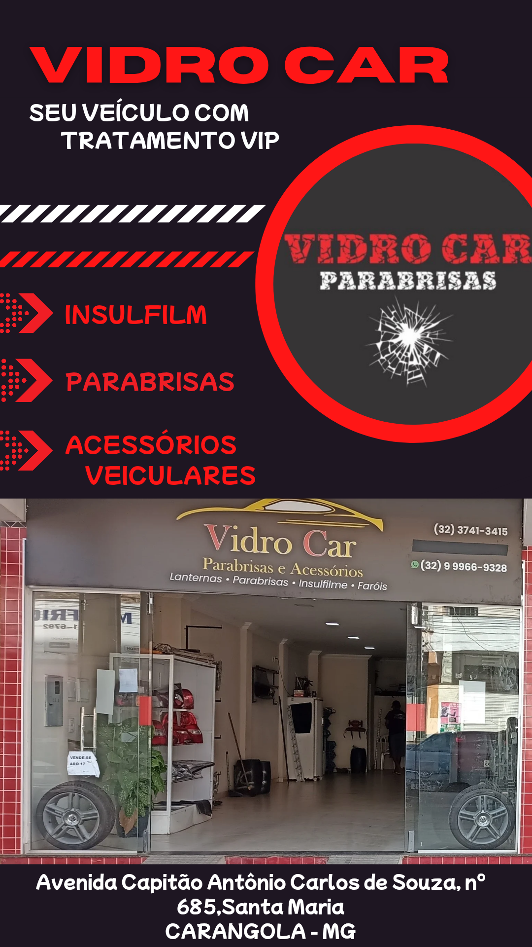 Quando o assunto é qualidade, segurança e confiança em serviços automotivos relacionados a vidros, a VIDRO CAR se destaca como referência regional em Carangola e toda a região. Localizada na Avenida Capitão Antônio Carlos de Souza, 685, bairro Santa Maria, a loja é especializada em: