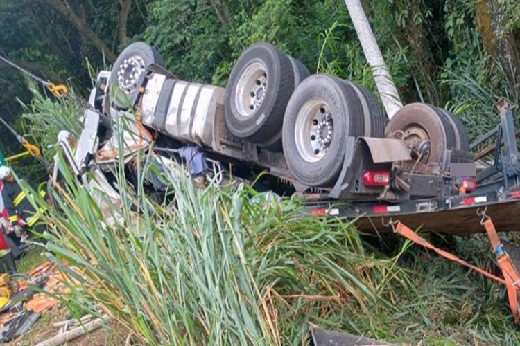 O veículo saiu de Volta Redonda (RJ) sentido São João do Manhuaçu, ocasião em que a carreta tombou as margens da pista.