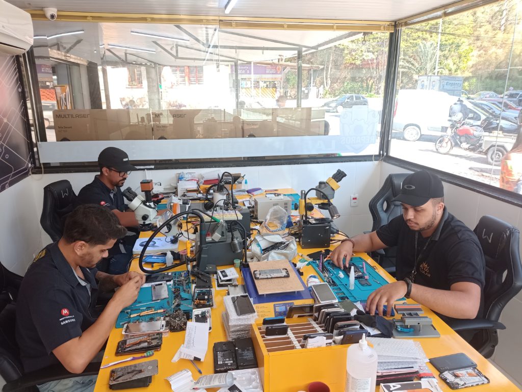 Técnicos do Rei do Celular trabalhando aos olhos dos clientes