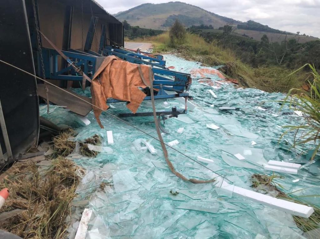 Uma carreta Scania, com placa de Teixeira de Freitas – BA, tombou na BR-116 no início da tarde deste sábado (28), em Vila de Fátima, próximo a Realeza, distrito de Manhuaçu. O veículo transportava vidros temperado e a carga ficou totalmente quebrada e espalhada em uma área de vegetação na margem da rodovia.