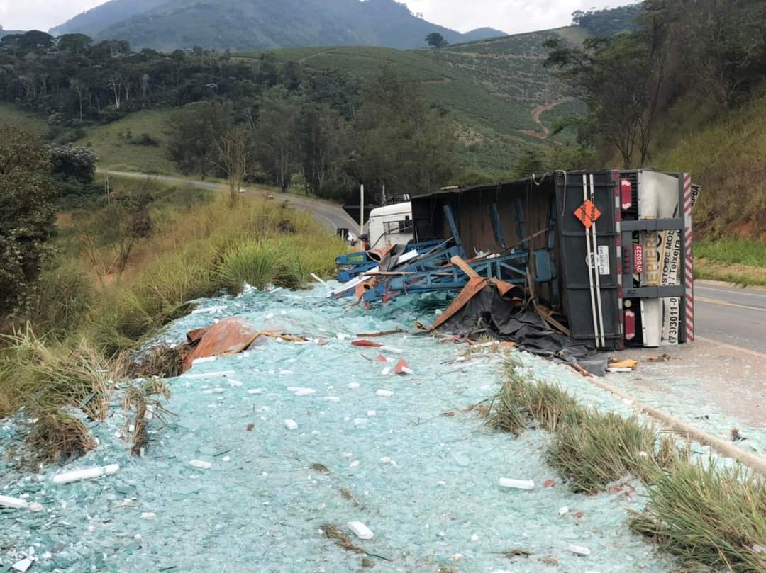 Uma carreta Scania, com placa de Teixeira de Freitas – BA, tombou na BR-116 no início da tarde deste sábado (28), em Vila de Fátima, próximo a Realeza, distrito de Manhuaçu. O veículo transportava vidros temperado e a carga ficou totalmente quebrada e espalhada em uma área de vegetação na margem da rodovia.