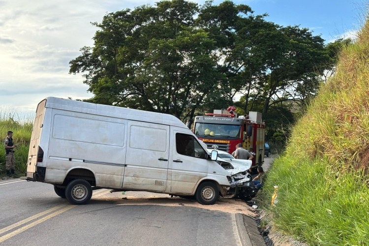 A van transportava vassouras de Belo Horizonte para Muriaé. Devido ao impacto a carga se deslocou para a cabine do motorista.