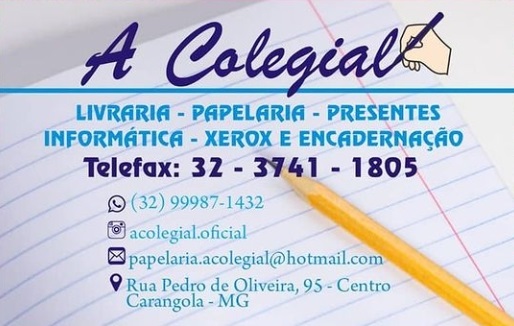 Bem no centro de Carangola está A COLEGIAL Papelaria e Livraria, uma loja completa, cheia de novidades e com variedade de materiais escolares, de escritório, de informática, além de eletrodomésticos e eletrônicos.