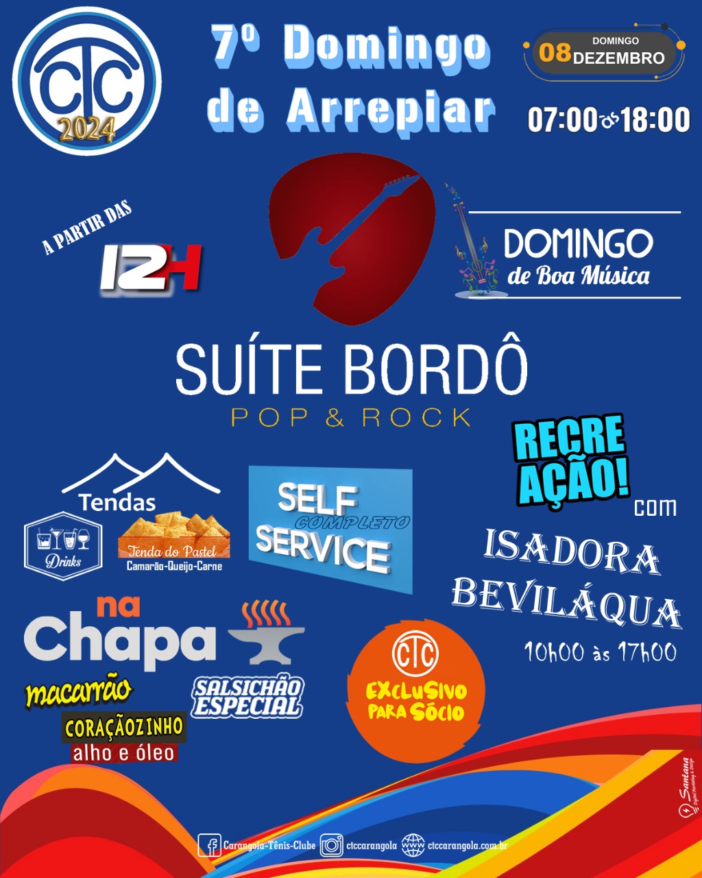 NESTE DOMINGO (08/12) TEM O 7° DOMINGO DE ARREPIAR NO CARANGOLA TÊNIS CLUBE, COM MÚSICA AO VIVO, RECREAÇÕES VÁRIAS BEBIDAS E PETISCOS