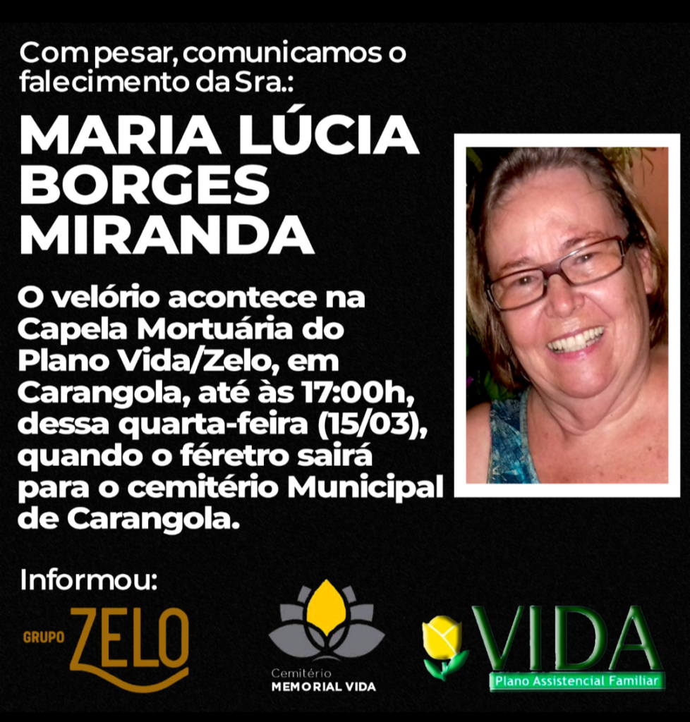 Noticiamos com pesar o falecimento da Senhora Maria Lúcia Borges Miranda. Familiares e amigos convidam para o seu sepultamento nesta quarta-feira, às 17h, saindo o féretro da Capela Velório do Plano Vida/Zelo onde o corpo está sendo velado para o cemitério local.