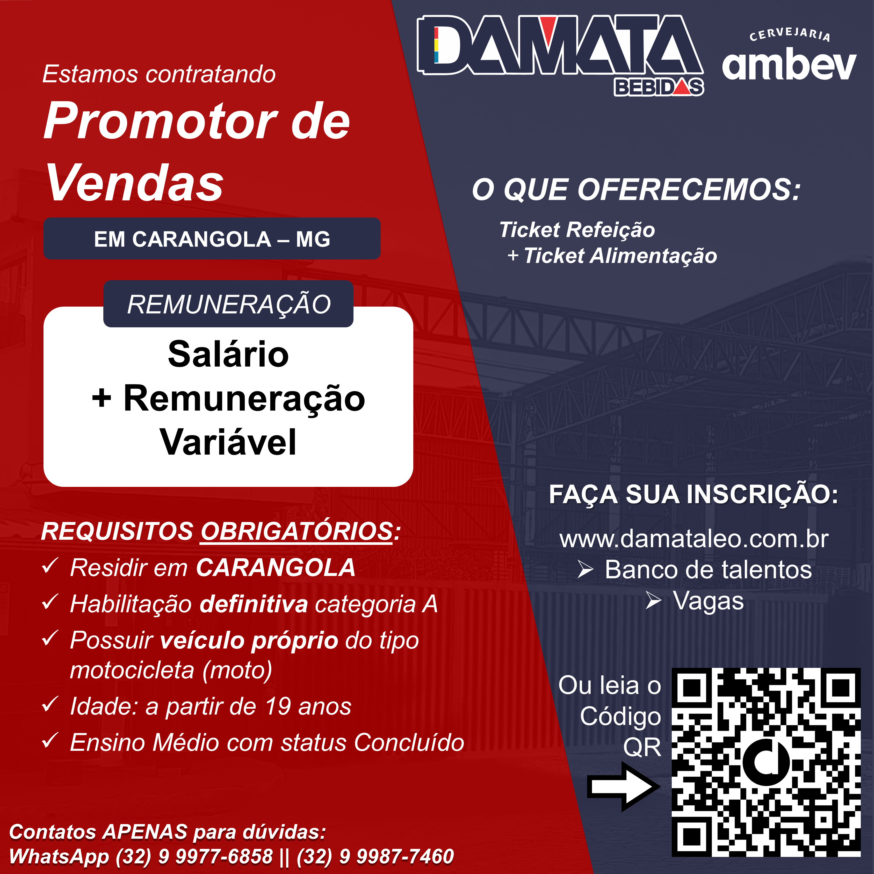 OPORTUNIDADE: DAMATA BEBIDAS OFERECE VAGA PARA O CARGO DE PROMOTOR DE VENDAS QUE RESIDA EM CARANGOLA; CLIQUE E SAIBA MAIS