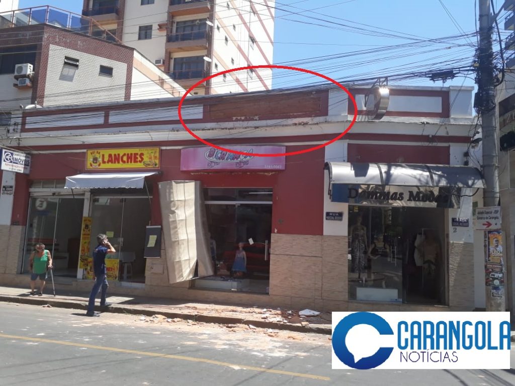 PARTE DA FACHADA DE UMA LOJA CAI NO CENTRO DE CARANGOLA E DEFESA CIVIL ISOLA RAPIDAMENTE O LOCAL