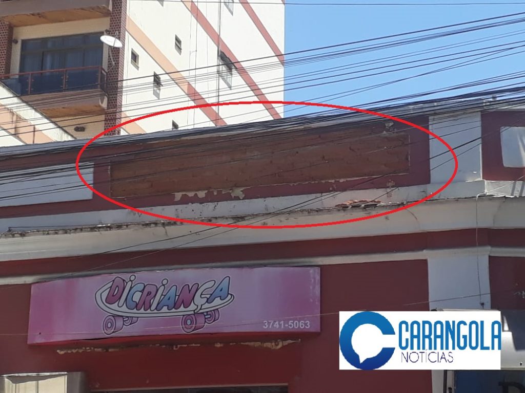 No início da tarde desta sexta-feira (18), o reboco da parte superior da fachada de uma loja no início da Rua Marechal Deodoro no centro de Carangola, veio a cair, tendo o peso do reboco chegado a derrubar o toldo da loja que funciona no imóvel. Graças a Deus ninguém passava na calçada no momento em que o embolso e o toldo caíram, não havendo, portanto, feridos.