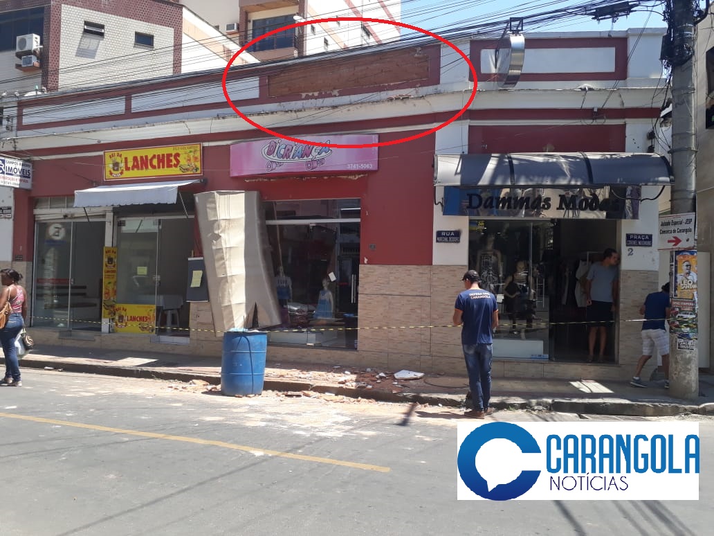 PARTE DA FACHADA DE UMA LOJA CAI NO CENTRO DE CARANGOLA E DEFESA CIVIL ISOLA RAPIDAMENTE O LOCAL