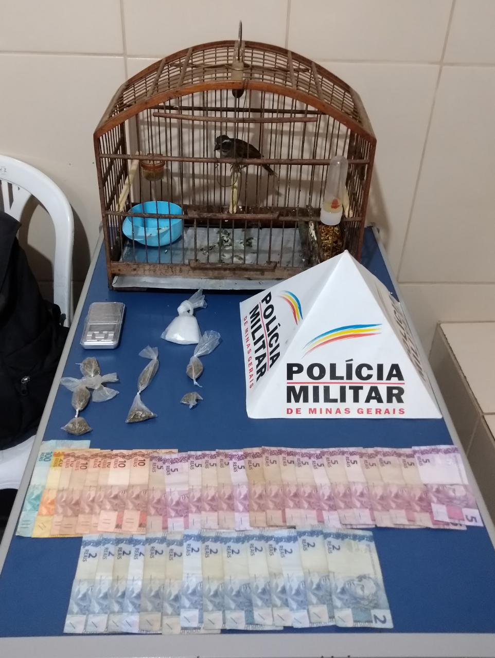 Em averiguação em sua residência foram localizadas mais buchas de maconha, um pássaro da fauna silvestre e a quantia de R$293,00 a qual o autor não informou a procedência.