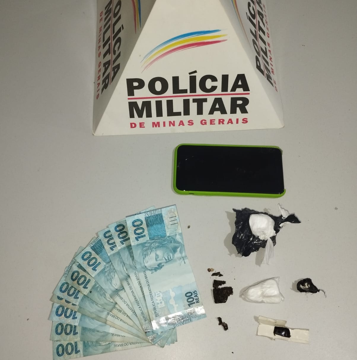 Durante a abordagem, os militares identificaram uma porção de cocaína exposta no local de trabalho do suspeito. Após buscas no interior do estabelecimento, foram localizadas outras porções de entorpecentes, além de dinheiro em espécie e um aparelho celular.