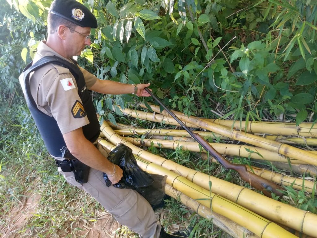 Nesta quinta-feira (20), a Polícia Militar de Faria Lemos recebeu denúncia anônima noticiando que alguém estaria guardando uma arma de fogo no Córrego Capa-gato, zona rural do município. Com base nas informações repassadas pelo(a) denunciante, os militares deslocaram até o local indicado e localizaram uma espingarda chumbeira ocultada entre bambus cortados à margem da via vicinal do córrego Capa-gato.