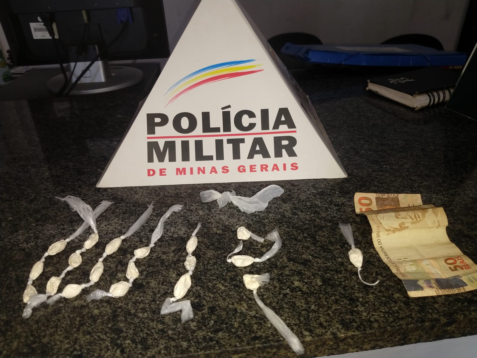 Nesta sexta-feira (21), durante patrulhamento, a equipe PM de São Francisco do Glória observou uma movimentação estranha, de indivíduos suspeitos de uso e consumo de drogas subindo a rua Maximiliano Vaz. Foi realizada a abordagem do indivíduo B. R. J. , sendo encontrado com este um papelote de substância análoga a cocaína em seu boné e 50,00 reais em seu bolso. Após questionamento esse não quis informar onde comprou.