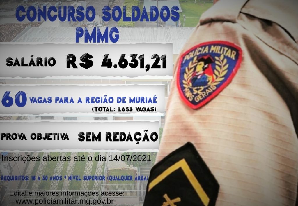 A Polícia Militar de Minas Gerais (PMMG) abriu concurso público para selecionar candidatos para o Curso de Formação de Soldados. Na 4ª RPM, que abrange o 47° Batalhão de Muriaé, são oferecidas 60 vagas; 54 para candidatos do sexo masculino e 6 para feminino. A remuneração inicial durante a formação é de R$ 3.962,26 e após formação é de R$ 4.631,21 como soldado de 1° Classe.