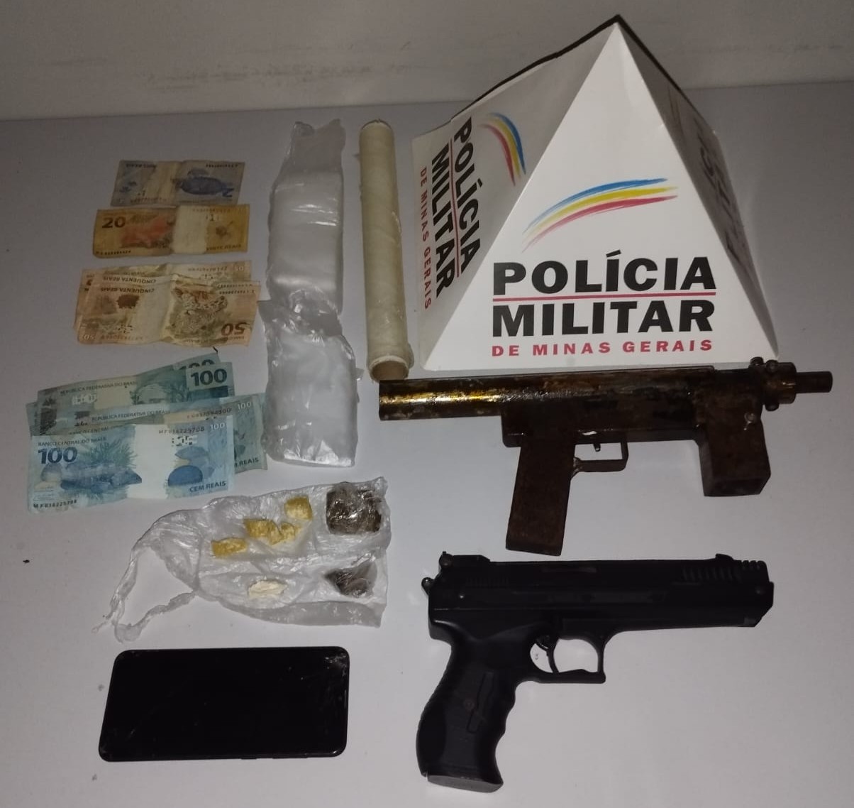 A equipe então realizou uma busca minuciosa na residência do suspeito, onde foram encontrados diversos materiais ilícitos, incluindo uma réplica de arma de fogo (pistola), uma submetralhadora artesanal, além de drogas e dinheiro. Entre os itens apreendidos estão: