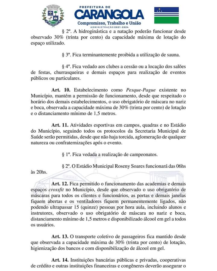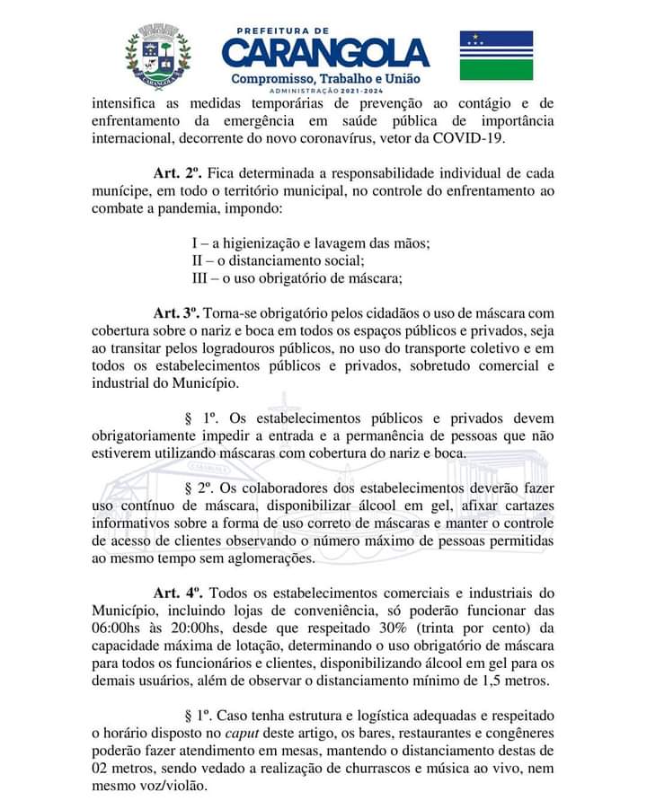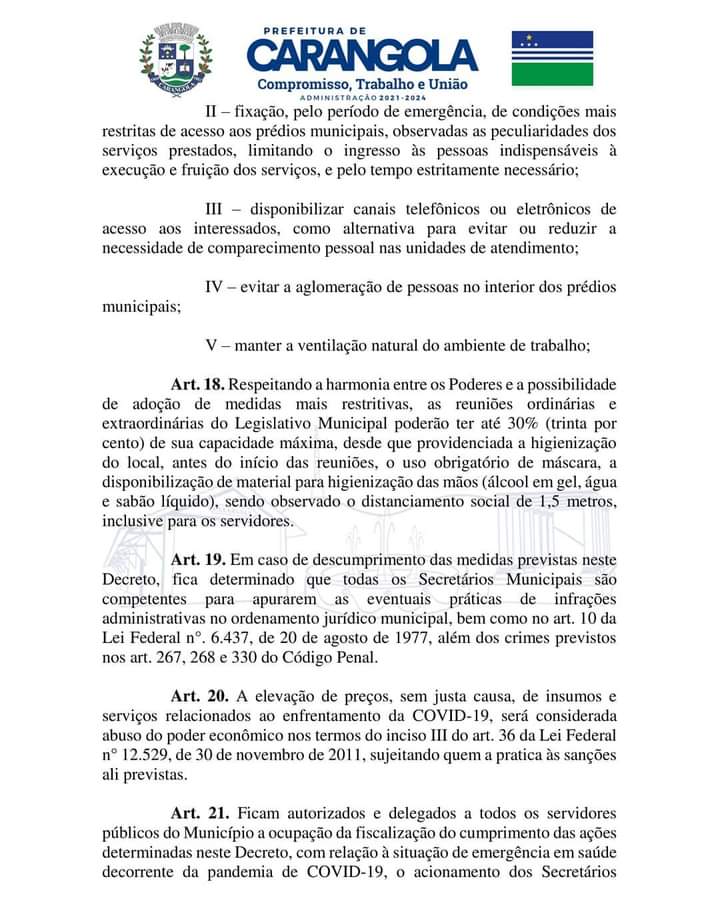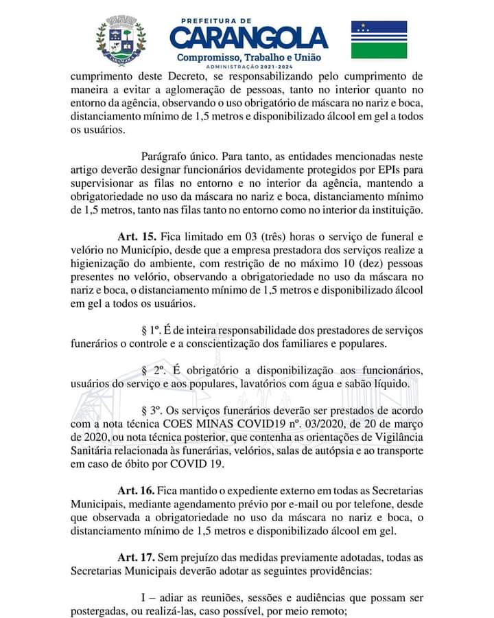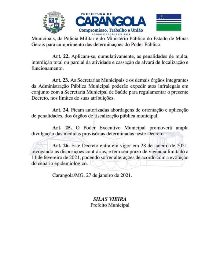 Decreto Municipal nº 014/2021 mantém a situação de emergência na saúde pública do municípo de Carangola/MG e adota outras medidas de enfrentamento da pandemia decorrente do coronavírus/Covid-19.