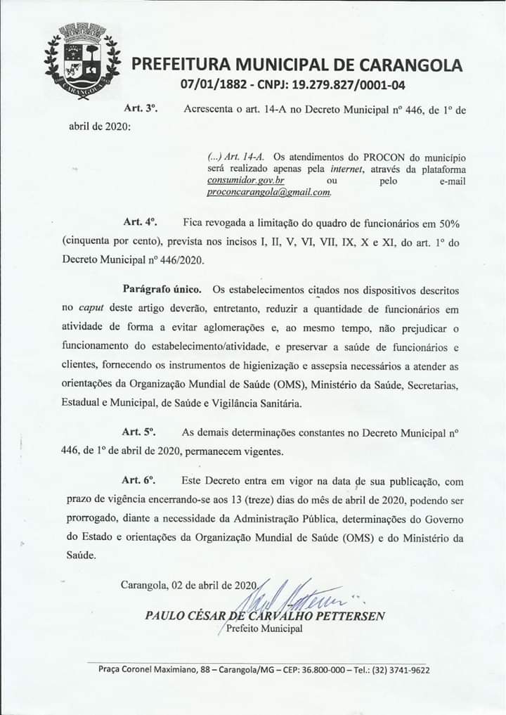 (…) Art. 14-A. Os atendimentos do PROCON do município será realizado apenas pela internet, através da plataforma consumidor.gov.br ou pelo e-mail proconcarangola@gmail.com.