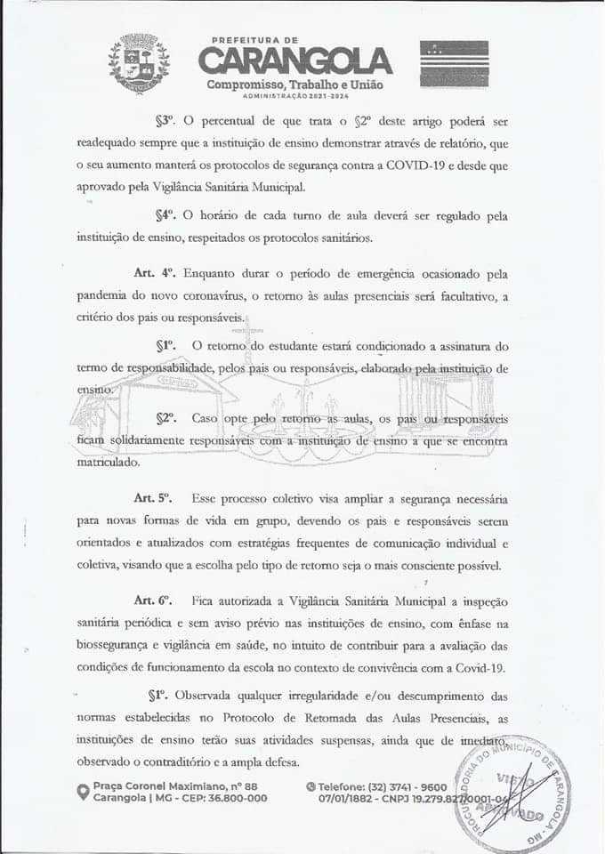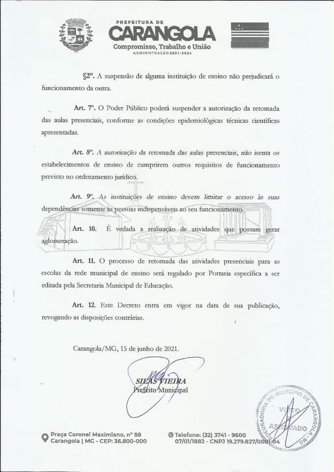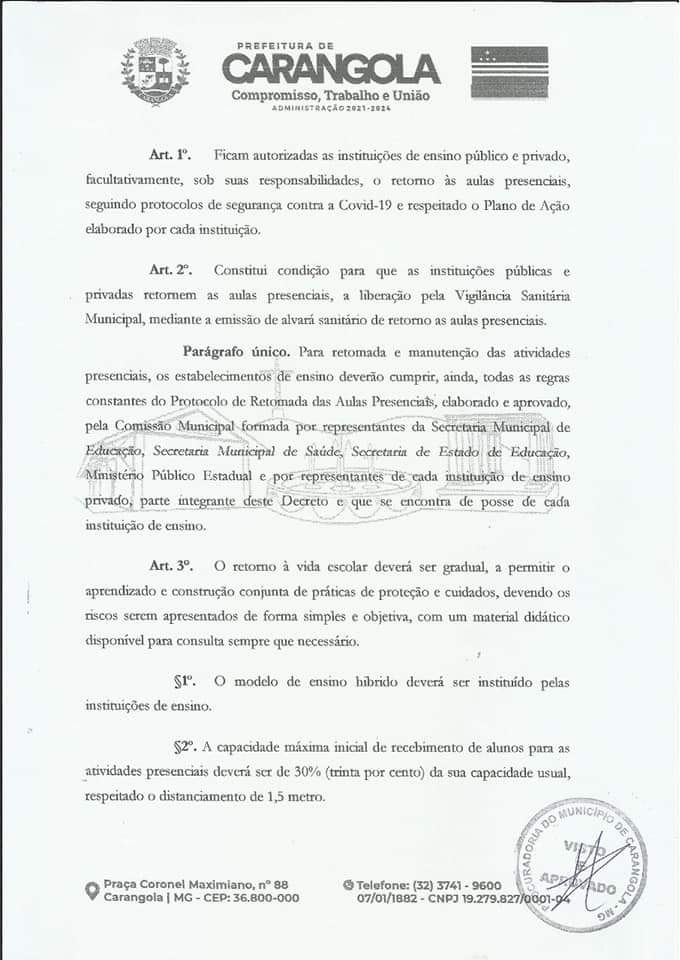 PREFEITO EMITE DECRETO REGULAMENTANDO O RETORNO DAS AULAS PRESENCIAIS EM CARANGOLA 15 de junho de 2021 Fonte: Prefeitura de Carangola