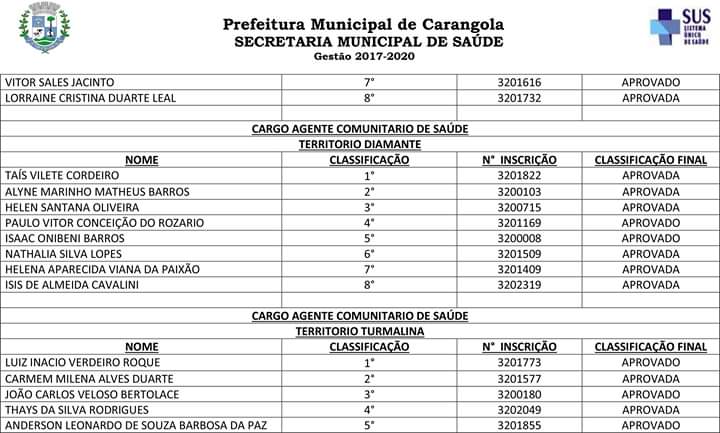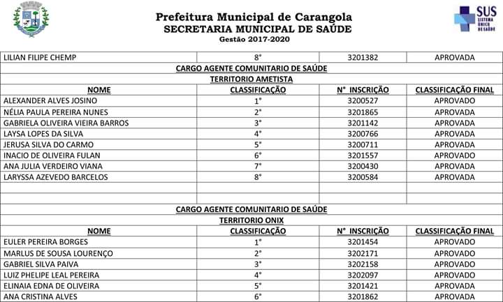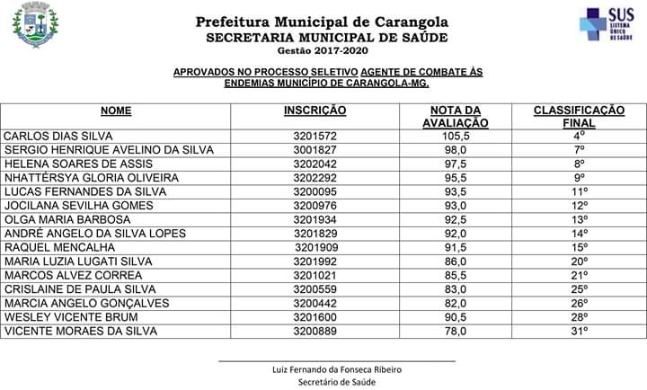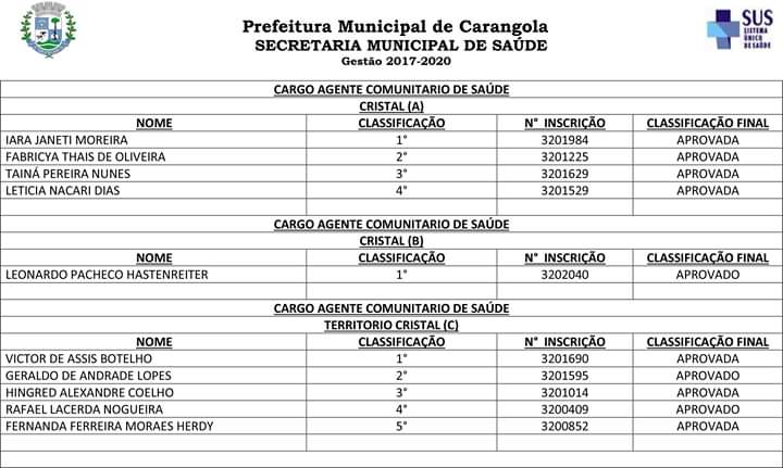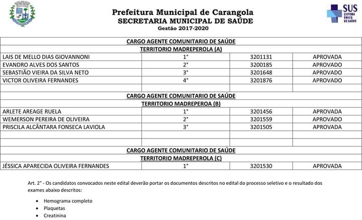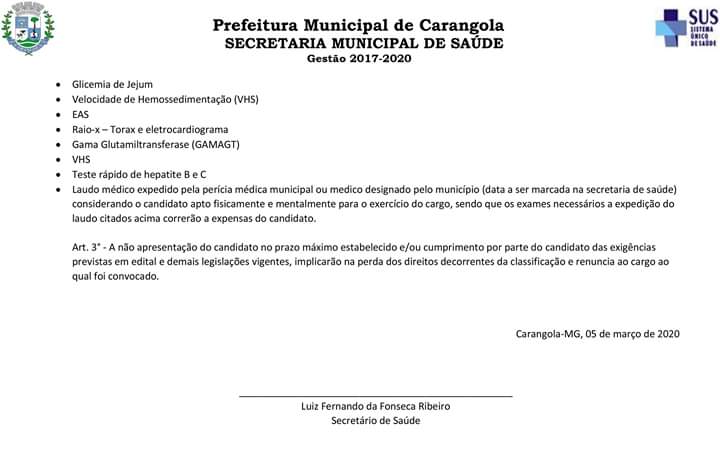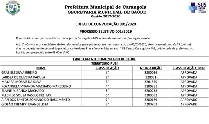 A Prefeitura Municipal de Carangola, através da Secretaria Municipal de Saúde, vem convocar os candidatos aprovados no processo seletivo 001/2019 anexo relacionados para que se apresentem a partir do dia 05/03/2020, até o prazo máximo de 15 (quinze) dias no departamento pessoal da prefeitura, situado na Praça Coronel Maximiano n° 88 Centro Carangola – MG, prédio sede da prefeitura, no horário compreendido entre 08:00 e 17:00.