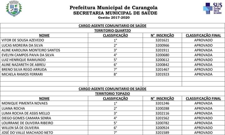 PREFEITURA DE CARANGOLA CONVOCA APROVADOS NO PROCESSO SELETIVO 01/2019; CLIQUE E CONFIRA LISTAGEM DOS APROVADOS