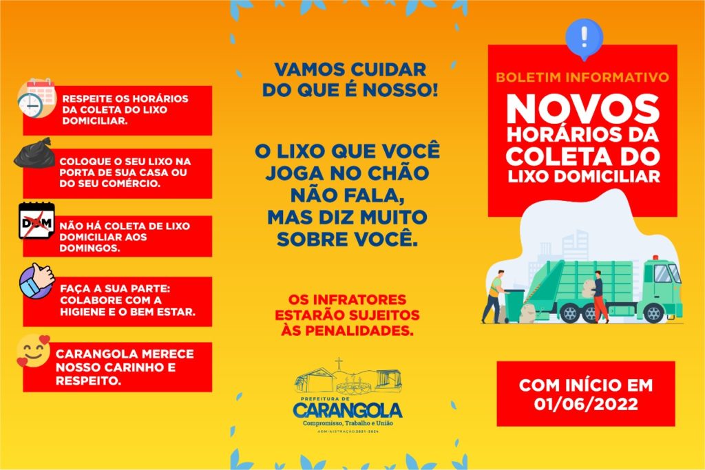 PREFEITURA DE CARANGOLA INFORMA NOVOS HORÁRIOS DA COLETA DO LIXO DOMICILIAR; CLIQUE E CONFIRA QUANDO O CAMINHÃO PASSARÁ EM SUA RUA! COLABORE!