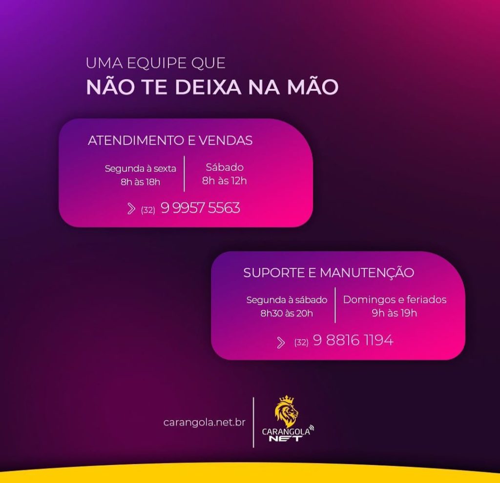 Entre em contato com o atendimento CARANGOLA NET, esclareça suas dúvidas e venha para o provedor que mais cresce na cidade!