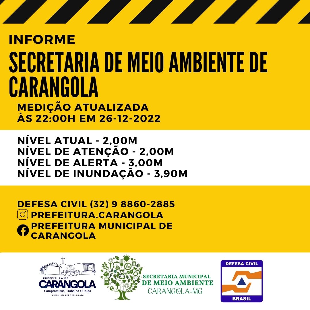 Após chuvas que estavam previstas para o dia de hoje (26/12/22) que se concretizaram, informamos que o Rio Carangola atingiu o nível de atenção, 2m às 21:55 horas. O tempo segue chuvoso em quase todas as regiões mineiras amanhã (27/12/22) com chuva moderada, incluindo a Zona da Mata. (Fonte: Cedec-MG)