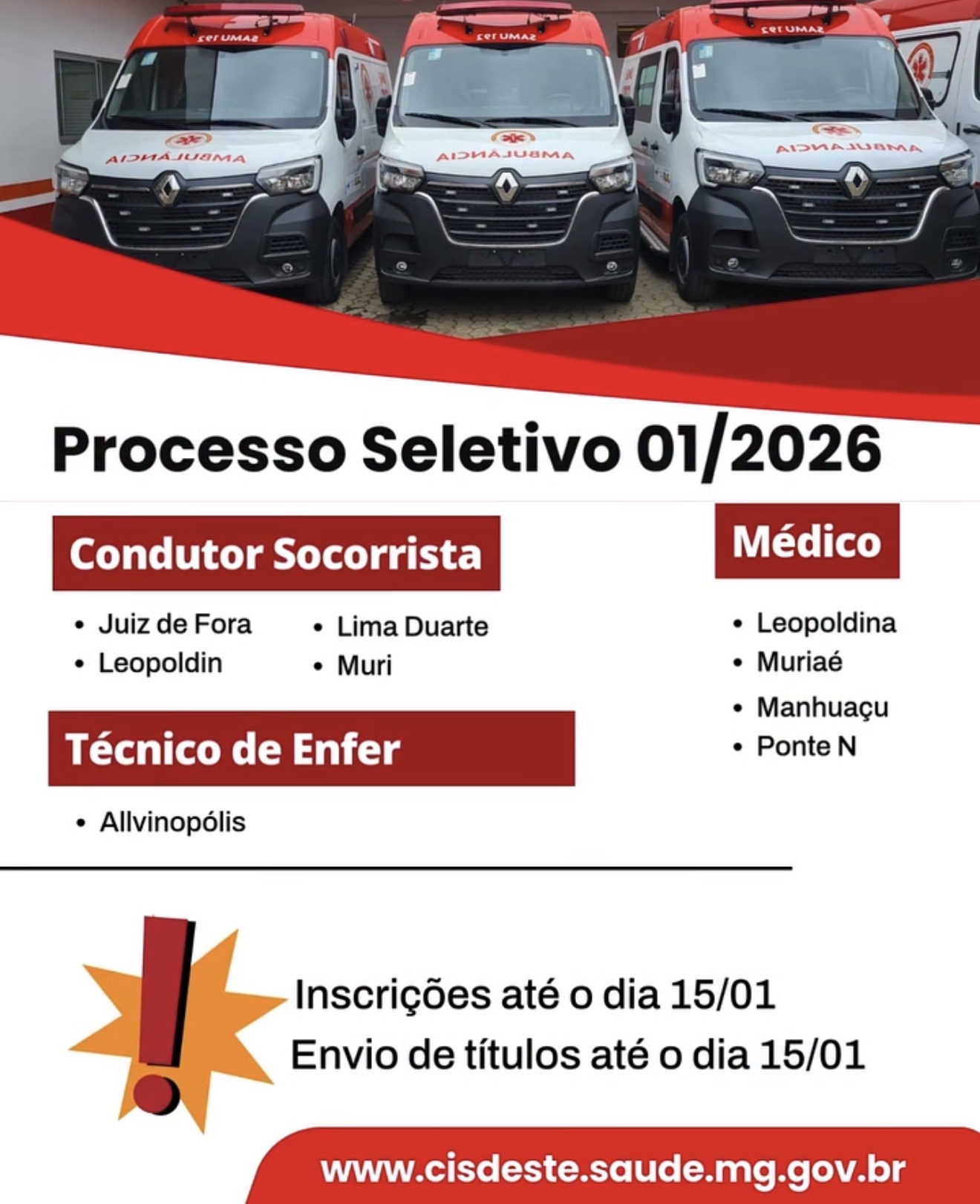 oo Para o contrato temporário de Técnico em Enfermagem, as oportunidades são para as bases de Alvinópolis. Já para o contrato temporário de Condutor-Socorrista, as vagas são para as bases de Juiz de Fora, Leopoldina, Lima Duarte e Muriaé.