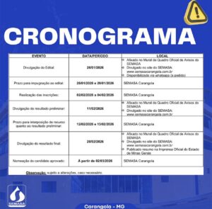 O SEMASA (Serviço Municipal de Saneamento Básico e Infraestrutura de Carangola-MG) anuncia a abertura de inscrições para o Processo Seletivo Simplificado destinado à contratação de profissionais, nos dias 02/02/2026 a 04/02/2026.