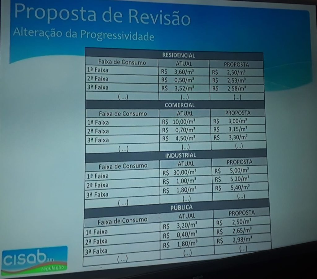A NOVA POLÍTICA de cobrança do SEMASA imposta pelo CISAB prevê que quanto MAIS ÁGUA SE GASTA, MAIOR SERÁ O VALOR DO M³ COBRADO (quem gasta mais pagará mais). Assim, alguns terão até um desconto em suas tarifas após o reajuste (aqueles que gastam menos), e outros terão aumentos consideráveis (aqueles que gastam mais). VEJA COMO FICARÁ A ALTERAÇÃO DE PROGRESSIVIDADE DAS CONTAS DE ÁGUA/ESGOTO: