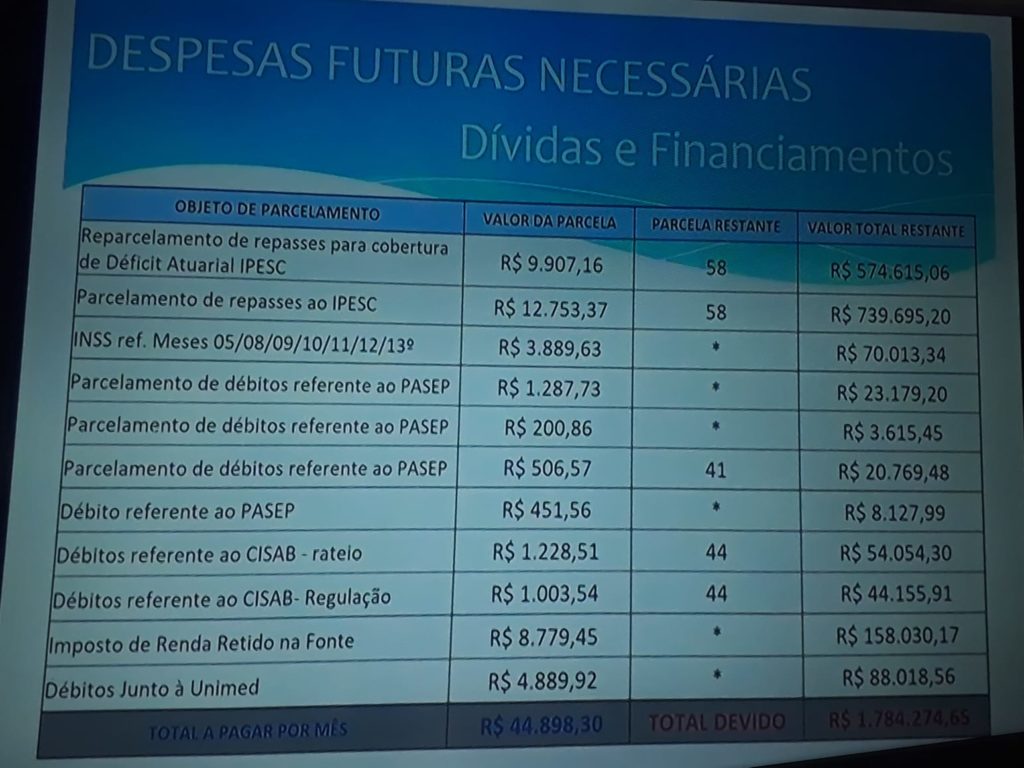 O representante do CISAB apresentou um estudo da situação financeira do SEMASA, que é bastante delicada para a sustentabilidade da autarquia. Somando-se as dívidas e os financiamentos de administrações passadas, o SEMASA deve o valor de R$ 1.784.274,65 (Um milhão setecentos e oitenta e quatro mil e duzentos e setenta e quatro reais e sessenta e cinco centavos) , conforme demonstra DETALHADAMENTE a imagem abaixo exposta pelo CISAB na audiência pública do dia 08/07: