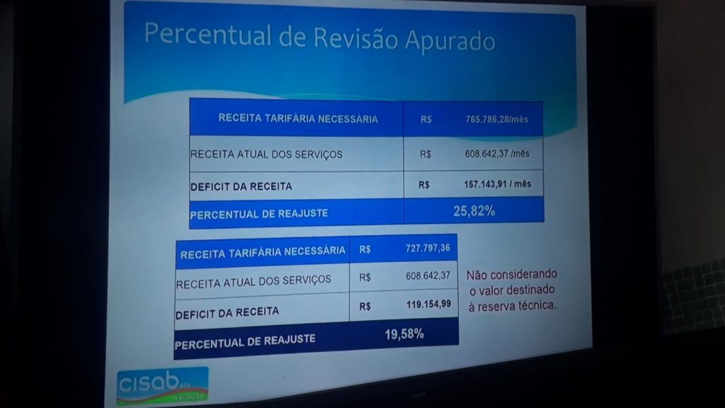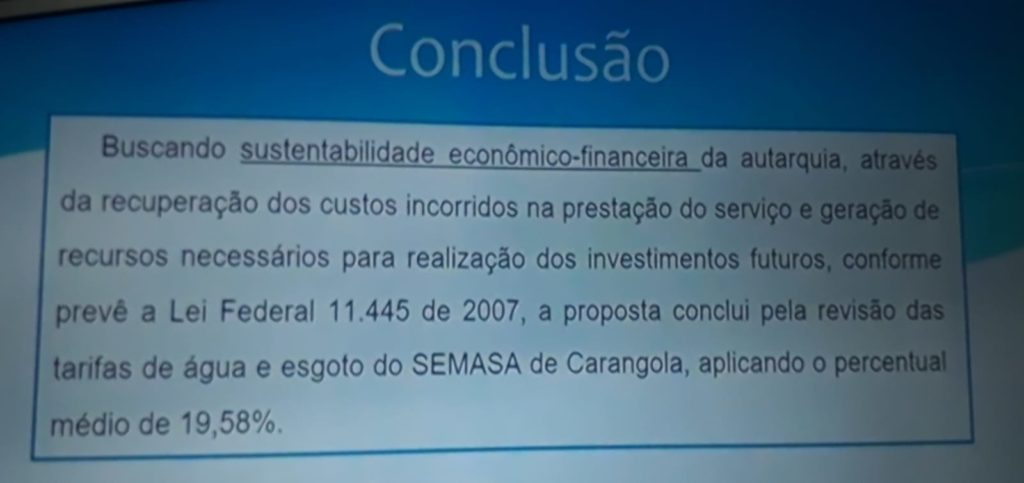 Como o SEMASA cobra TARIFA de seus usuários, e não taxa, o CISAB informou que o REAJUSTE a ser aplicado na Tarifa do SEMASA NÃO PASSA PELA CÂMARA MUNICIPAL DE CARANGOLA, NÃO CABENDO TAMBÉM INTERVENÇÃO DO EXECUTIVO neste reajuste, sendo uma competência exclusiva da agência reguladora CISAB. Após estudo apresentado AOS DOIS VEREADORES presentes, chegou-se a uma conclusão de que É NECESSÁRIO O REAJUSTE MÉDIO DE 19,58% para que o SEMASA consiga se manter em funcionamento, isso sem calcular qualquer RESERVA TÉCNICA para investimentos com recursos próprios. Veja o slide exposto na apresentação do CISAB na audiência pública e a sua conclusão:
