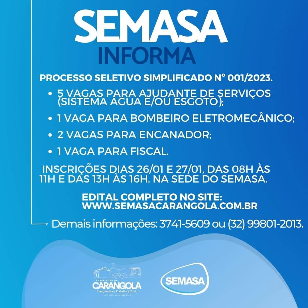 SEMASA REALIZARÁ PROCESSO SELETIVO SIMPLIFICADO PARA VAGAS DE AJUDANTE DE SERVIÇOS GERAIS, BOMBEIRO, ENCANADOR E FISCAL; CLIQUE E SAIBA MAIS
