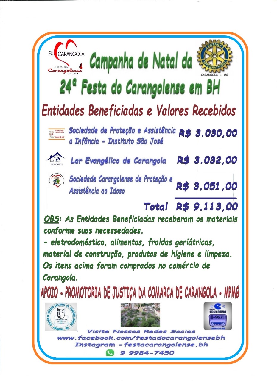 SOLIDARIEDADE: CAMPANHA DE NATAL DA 24ª FESTA DO CARANGOLENSE EM BH FAZ DOAÇÃO A TRÊS ENTIDADES FILANTRÓPICAS CARANGOLENSE; CLIQUE E CONFIRA AS ENTIDADES BENEFICIADAS E OS VALORES DOADOS