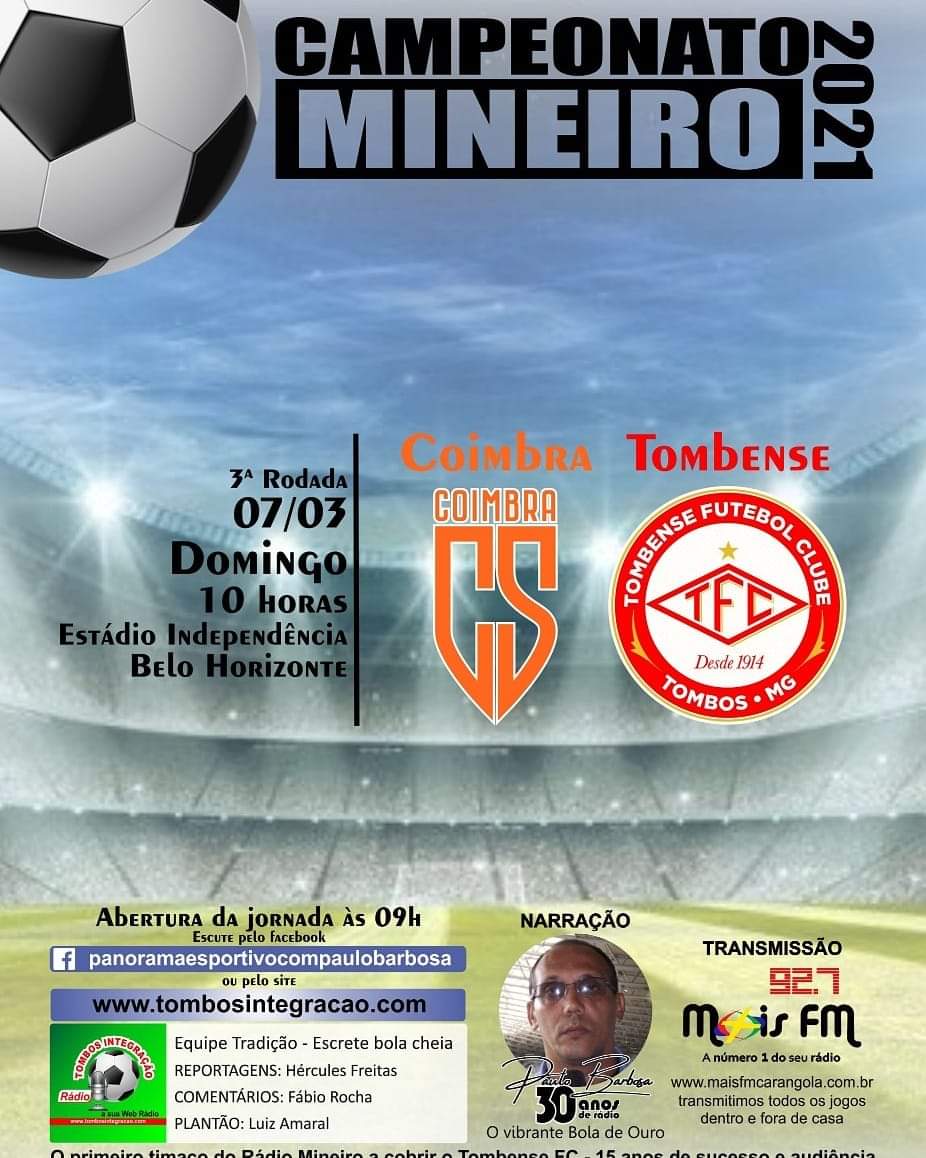 O time do TOMBENSE vai em busca da primeira vitória em BH em jogo contra o Coimbra no Independência a partir das 10h da manhã. A partida será transmitida pela rádio Mais FM 92,7 ou tombosintegracao.com com Paulo Barbosa e equipe.
