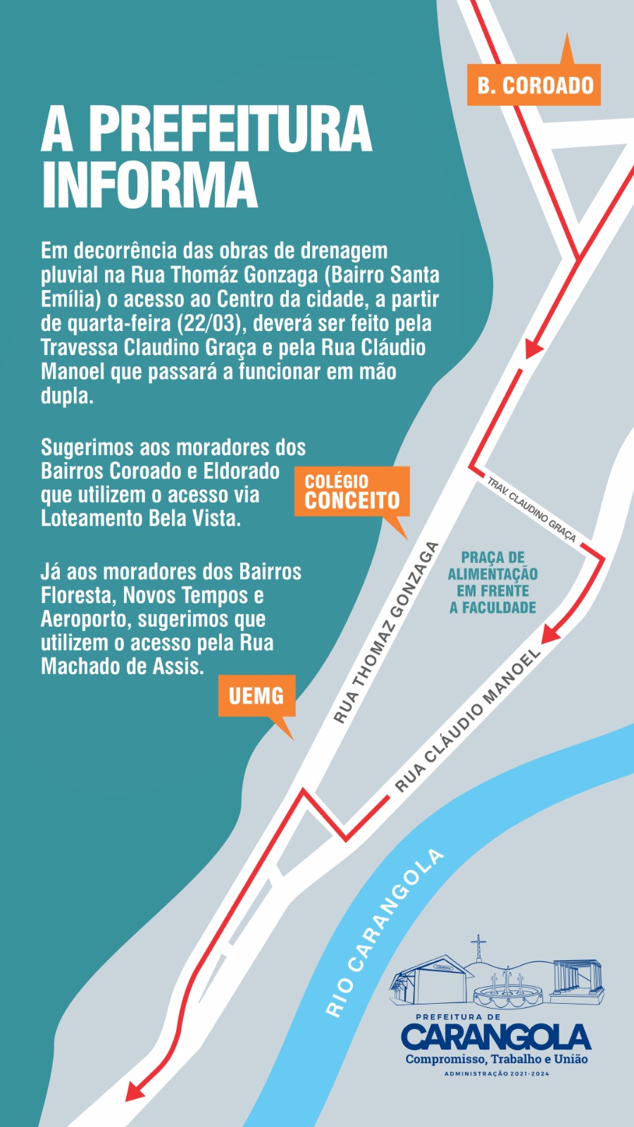 TRÂNSITO: PREFEITURA DE CARANGOLA COMUNICA INTERDIÇÃO PARA OBRA DA RUA THOMÁZ GONZAGA E MUDANÇA NA RUA CLÁUDIO MANOEL PARA MÃO DUPLA ATÉ A UEMG