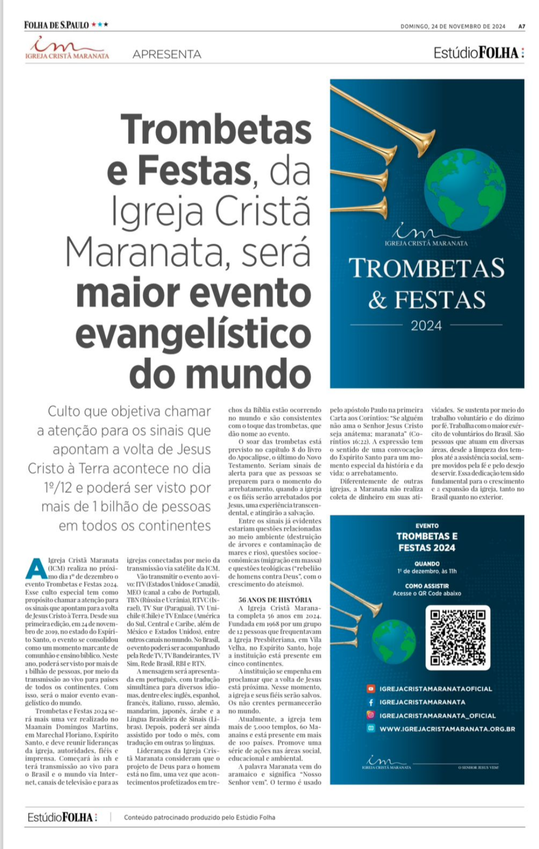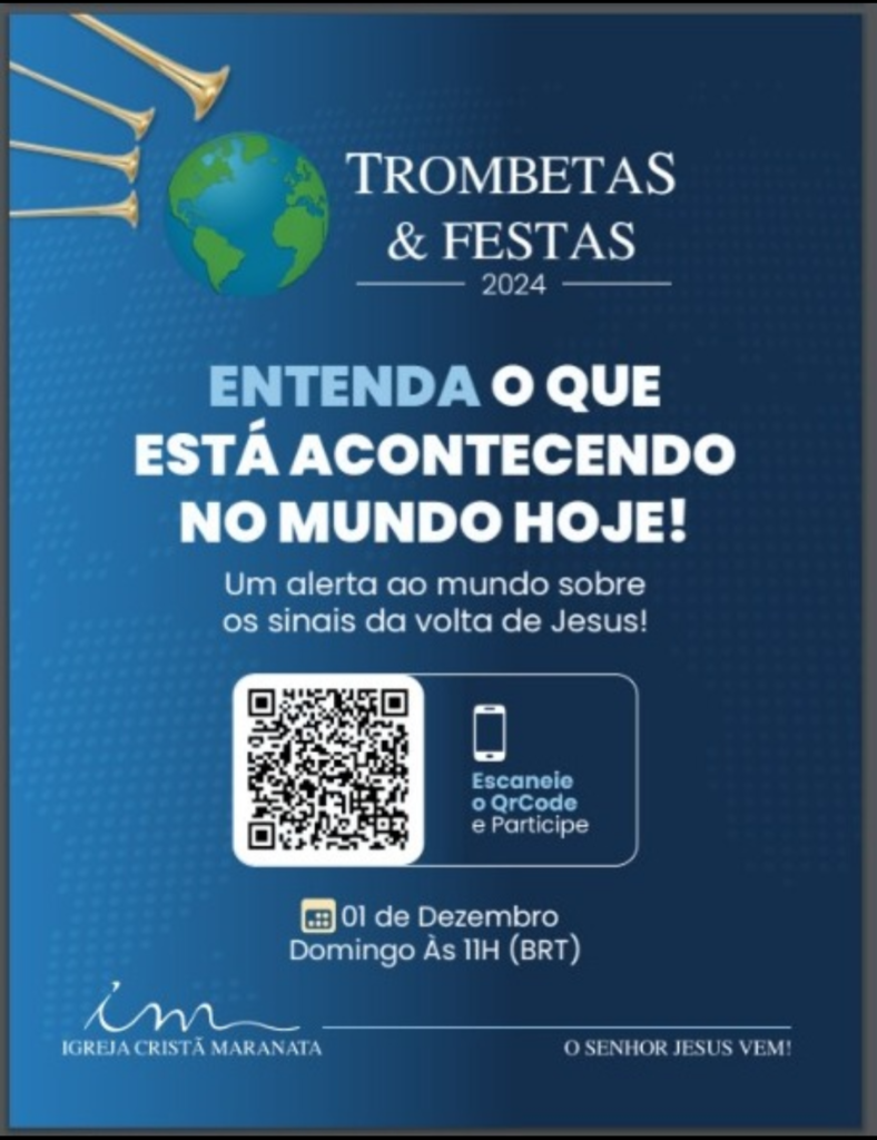A Igreja Cristã Maranata (ICM) realiza no próximo dia 1º de dezembro o evento Trombetas e Festas 2024. Esse culto especial tem como propósito chamar a atenção para os sinais que apontam para a volta de Jesus Cristo Terra.