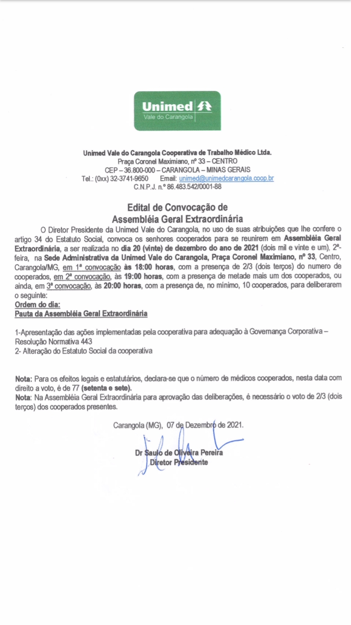 UNIMED VALE DO CARANGOLA DIVULGA EDITAL DE CONVOCAÇÃO DE ASSEMBLEIA GERAL EXTRAORDINÁRIA 8 de dezembro de 2021 Fonte: Unimed Vale do Carangola
