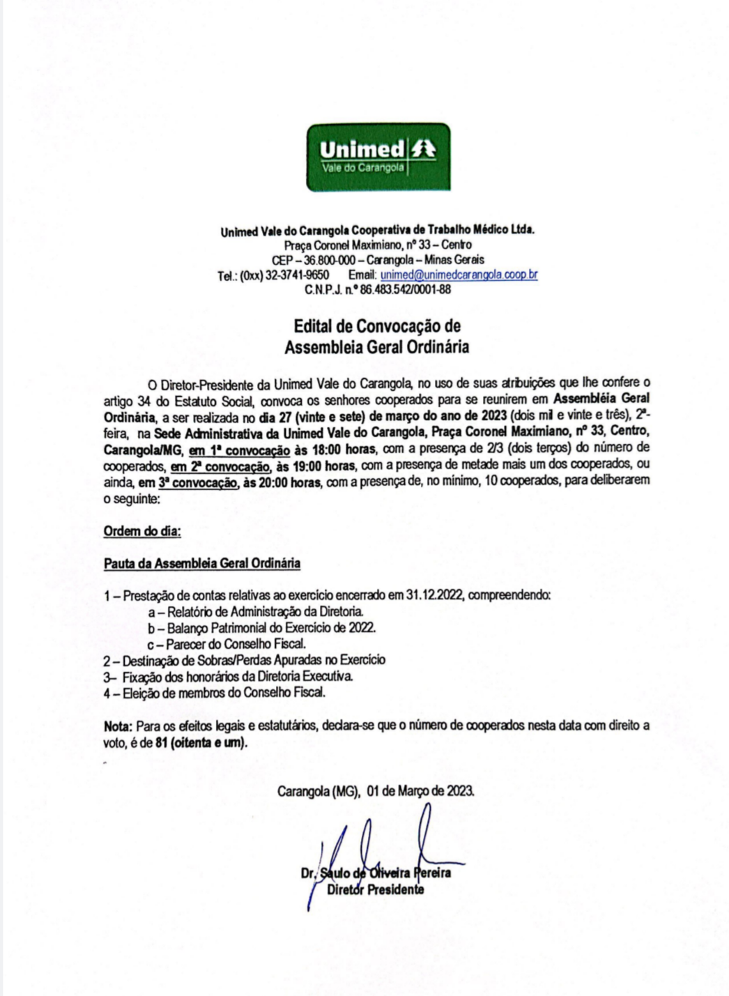 UNIMED VALE DO CARANGOLA DIVULGA EDITAL DE CONVOCAÇÃO DE ASSEMBLEIA GERAL ORDINÁRIA 7 de março de 2023 Fonte: Unimed Vale do Carangola