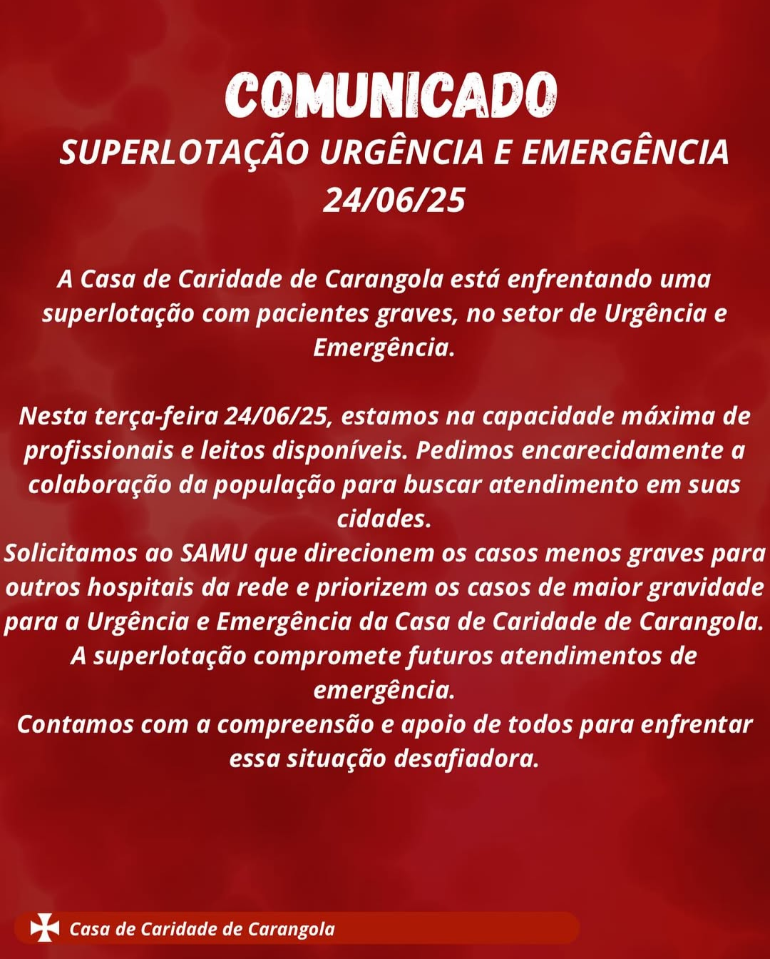 URGENTE: CASA DE CARIDADE DE CARANGOLA COMUNICA SUPERLOTAÇÃO NO SETOR DE URGÊNCIA E EMERGÊNCIA E SUGERE QUE PACIENTES COM CASOS MENOS GRAVE BUSQUEM ATENDIMENTOS EM SUAS RESPECTIVAS CIDADES; CLIQUE E CONFIRA O COMUNICADO NA ÍNTEGRA